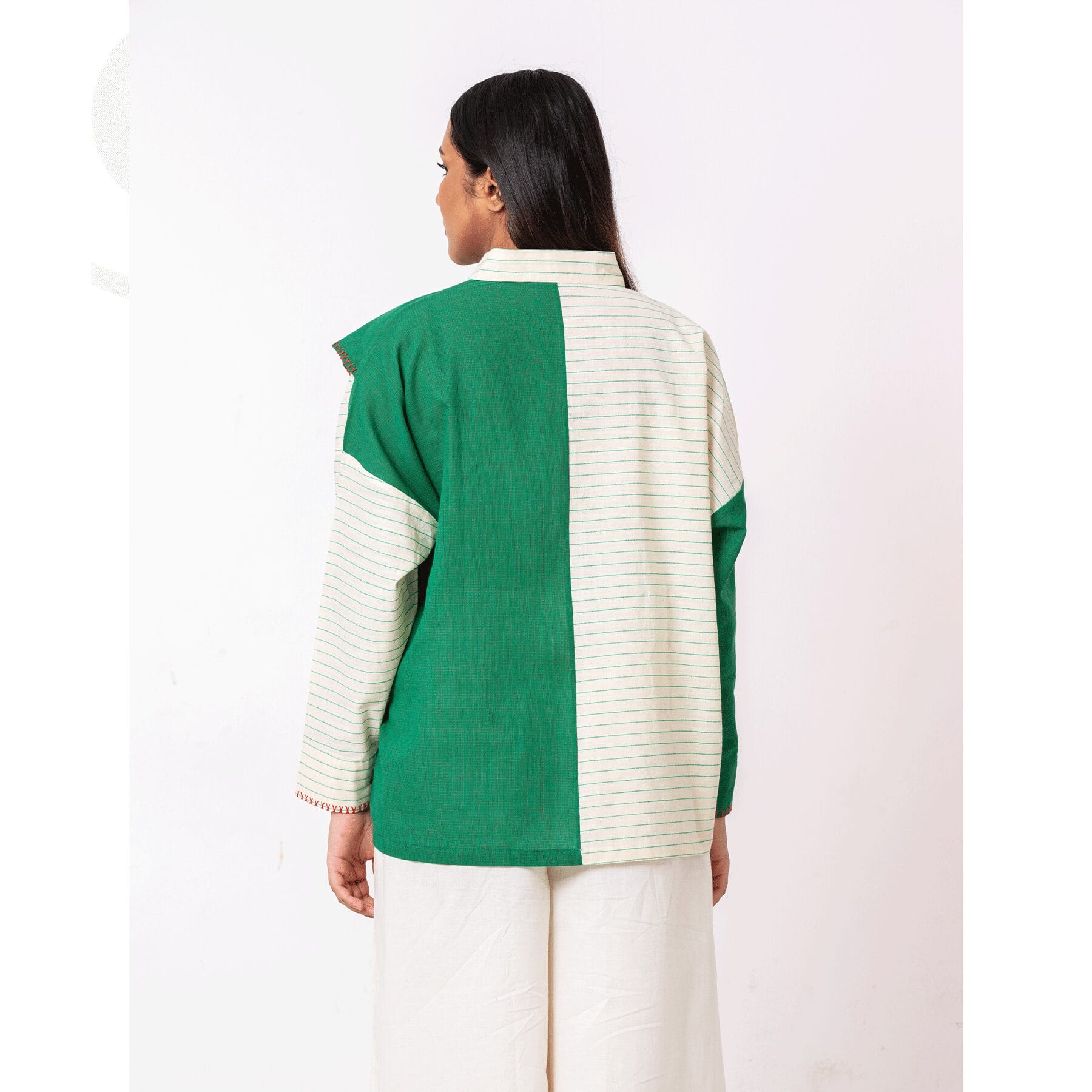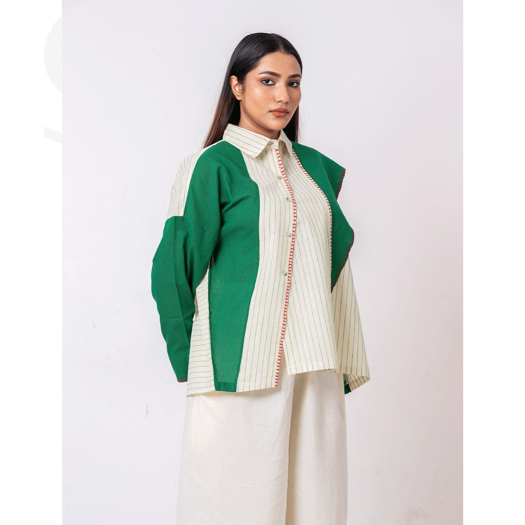 Make a bold statement with the Dual-Tone Sustainable Button-Up Shirt, a unique blend of sophistication and contemporary style. This top features a striking green and cream panel design with fine vertical stripes for a modern yet timeless look. The detailed red-stitched button placket adds an artisan touch to the overall aesthetic.