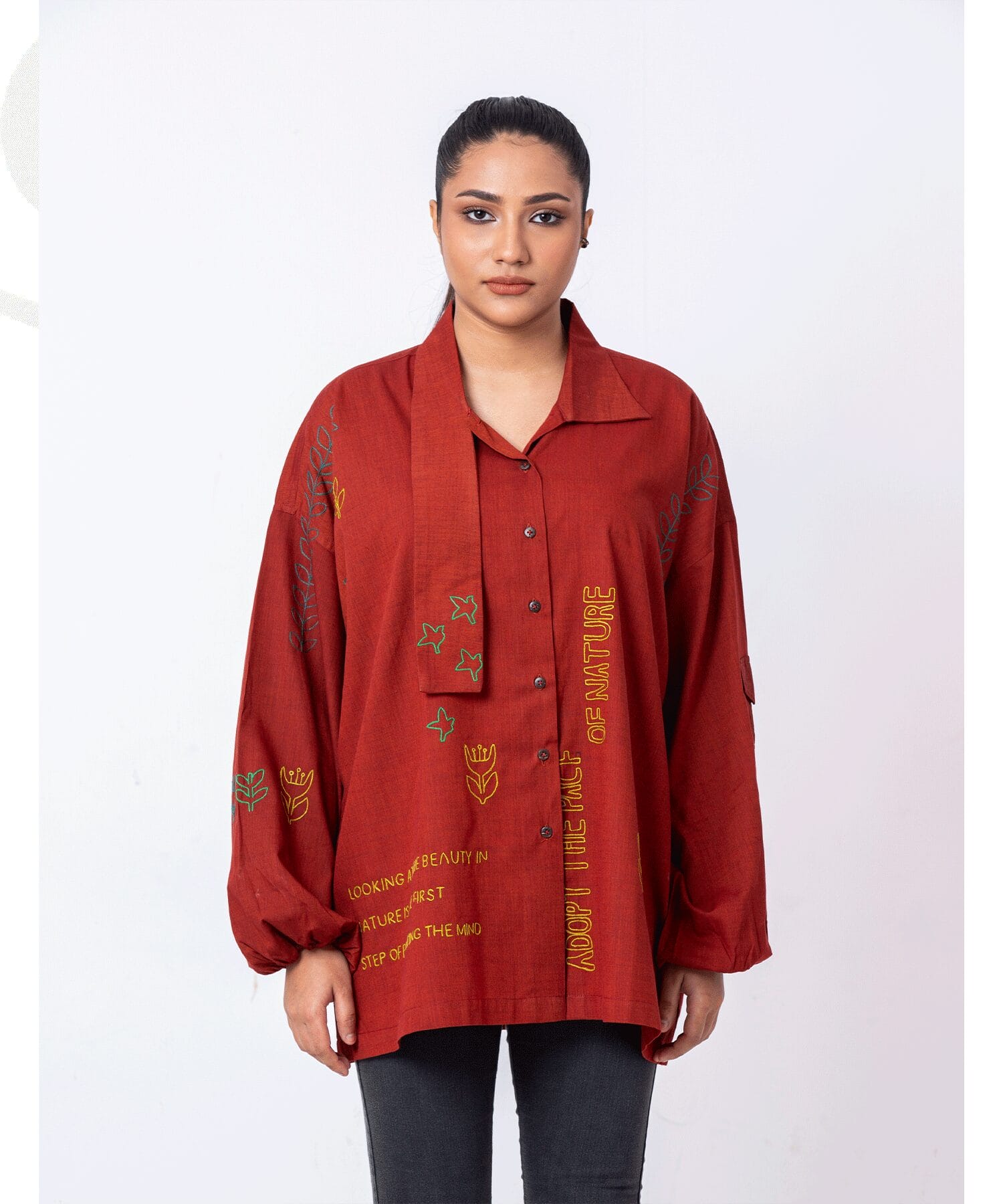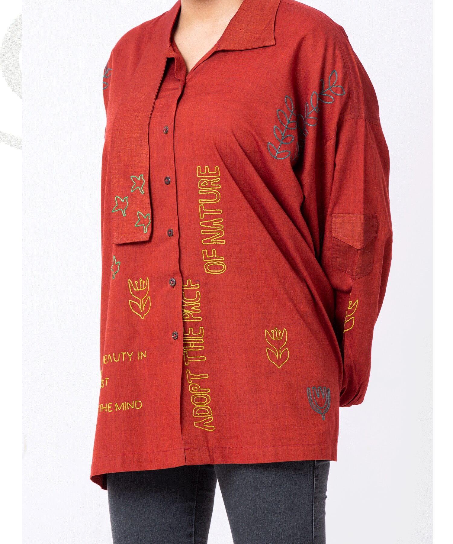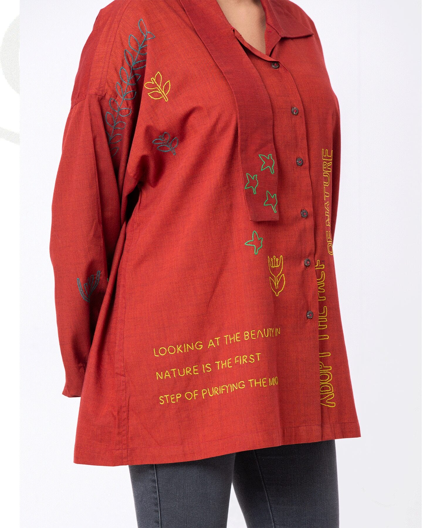 A loose-fitting, rust-red shirt featuring elegant embroidery in bright, nature-inspired designs. The text “Adopt the Pace of Nature” adds a meaningful statement. Made from breathable, sustainable fabric, this shirt combines comfort and style, ideal for casual wear or layering.