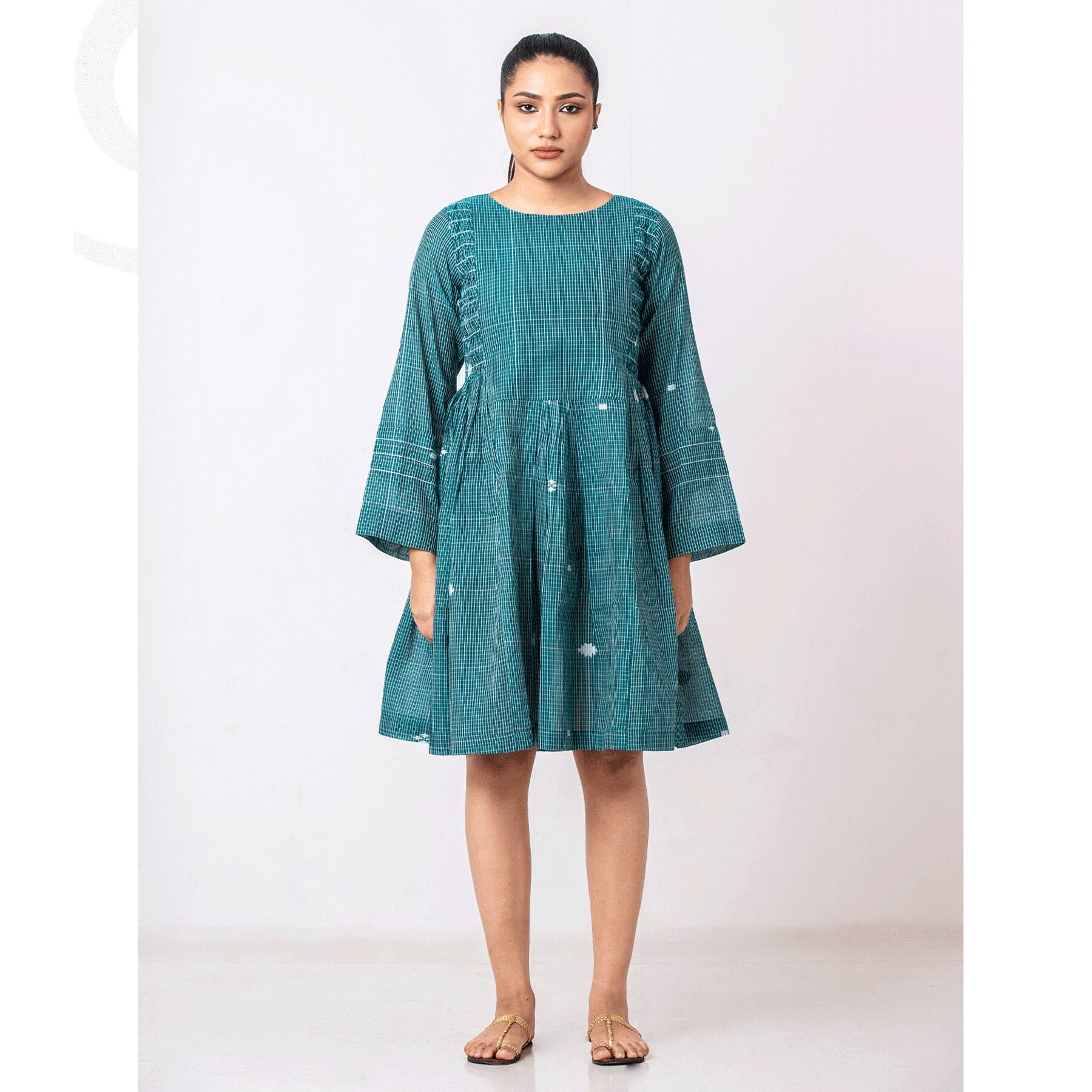A contemporary take on a timeless silhouette, this teal A-line dress features a subtle checkered pattern with hand-embroidered details. The full-length sleeves and gathered waist provide a flattering and comfortable fit. Perfect for casual gatherings or relaxed evenings, this dress adds a touch of sophistication to your wardrobe while staying true to sustainable fashion values.